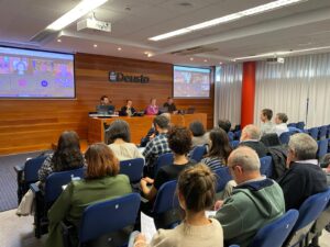 La jornada comenzó con las palabras de bienvenida de Xabier Riezu, Vicerrector del campus de San Sebastián y de Política Lingüística de la Universidad de Deusto, al que acompañaron Martín Iriberri, Director General de Alboan y Entreculturas y Álvaro Idárraga, Secretario Ejecutivo de la Red Comparte. Bajo el título «Claves y frutos de la colaboración intersectorial para la justicia socioambiental: Deusto Business School, Alboan y Red Comparte» se celebró, a continuación, una mesa redonda en la que participaron: Francisco Javier Arellano, Vicerrector de Investigación y Relaciones Internacionales de la Universidad de Deusto, con la ponencia: «Una mirada local y global a la colaboración universitaria y del sector social», Josune Sáenz, Vicedecana de Investigación y Transferencia de DBS que se centró en la ponencia «Una historia de colaboración: 10 años de camino recorrido entre DBS, Fundación Alboan y la Red Comparte» y Jenny Mera, Coordinadora de Iniciativas Económicas Solidarias de Hogar de Cristo (Ecuador), quien habló sobre los «Resultados y oportunidades que nacen de la colaboración en la mejora de las iniciativas económico-productivas de Hogar de Cristo y de las condiciones de vida de las personas y grupos acompañados».